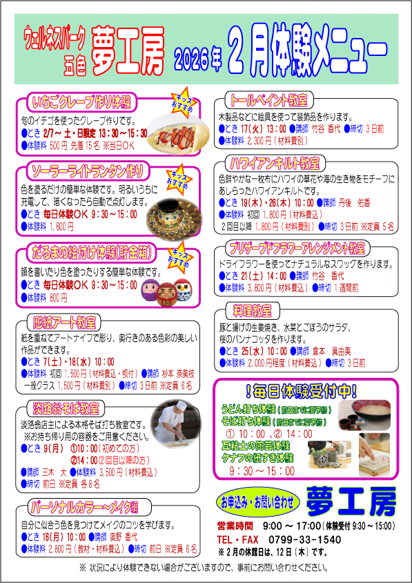 2月 夢工房体験メニュー2026.01.302月の体験メニューです。