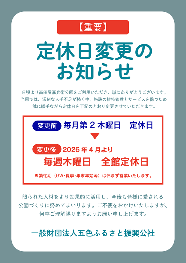 【重要】定休日変更のお知らせ2026.02.01日頃より高田屋嘉兵衛公園をご利用いただき、誠にありがとうござ -