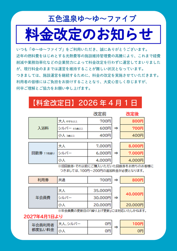 【ゆ~ゆ~ファイブ】料金改定のお知らせ2026.02.01いつも五色温泉ゆ~ゆ~ファイブをご利用いただき、誠にありがと -