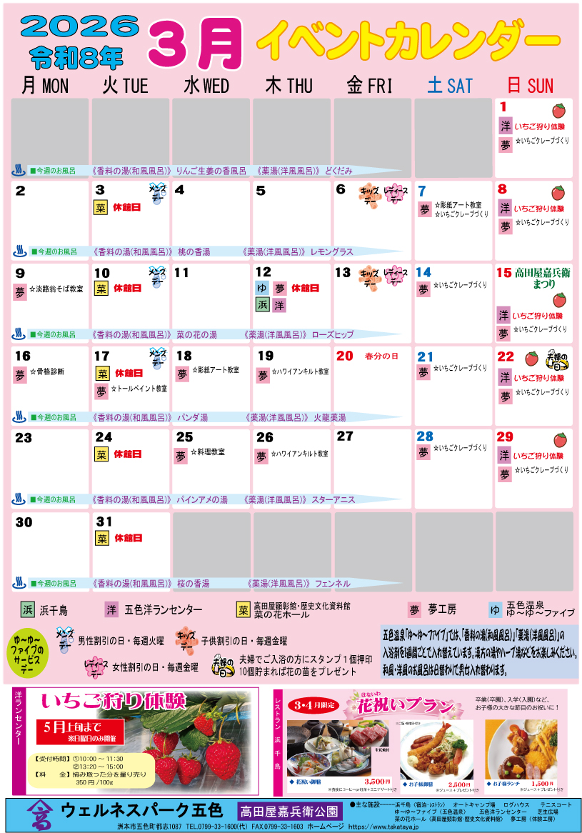 臨時休園日のお知らせ2026.01.10平素よりウェルネスパーク五色をご愛顧いただき、誠にありがとう-