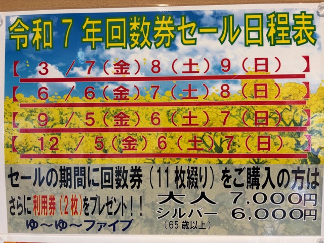 今年最後の「回数券セール」です! ゆ〜ゆ〜ファイブ洲本市 2025.12.02 温泉 12月5日(金)~7日(日)の3日間、今年最後の「回数券セール」を行います。 セール期間中は、通常 1冊(11枚綴り)とさらに 2枚の利用券 をプレゼントいたします!!! 全部で13枚と大変お得なセールになっています。 温泉にゆっくりと入って、今年1年の疲れを癒してもらう そんな「特別な時間」を過ごすのは、自分への最高のプレゼントだと思います! ぜひ、この機会に大変お得な回数券セールをご利用ください。 この記事を書いた人 てるてる坊主 ドライブが唯一の趣味です。休みの日は結構な確率で出かけています。現在58歳のぽっちゃりおじさんです。 この人が書いた他の記事はこちら
