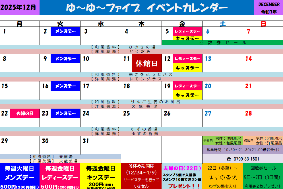 12月イベントカレンダー🤩 ゆ〜ゆ〜ファイブ高田屋嘉兵衛公園 2025.12.01 温泉 12月5.6.7日の三日間は回数券セールがあります。 また、22日の冬至から一週間は、和風香料風呂にて『ゆずの香湯」を 柚子の果実入りでお楽しみいただけます😄 寒さ厳しいこの時期、ゆずの香湯や火龍薬湯で温まってね😄 この記事を書いた人 PON 趣味は読書(小説・漫画)ですが、最近、ボケ防止でナンプレにはまってるおばさんです。 この人が書いた他の記事はこちら
