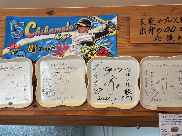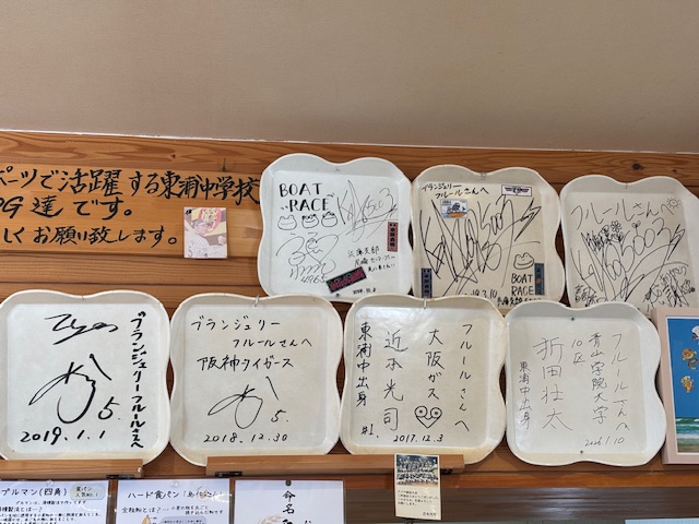 東浦中学校OG 阪神の近本選手のサインやタオル、青山学園大学折田選手のサインも飾ってあります。