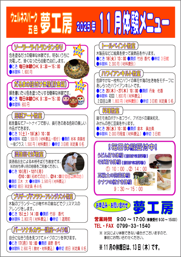 11月 夢工房体験メニュー 2025.11.01 11月の体験メニューです。<br 夢工房 体験メニュー最新のお知らせ 「流しそうめん体験」が始まります! 2025.07.02 7月から夢工房で「流しそうめん体験」が始 夢工房 体験メニュー最新のお知らせ 夢工房 6月の体験メニュー 2025.05.31 6月の体験メニューです。<br / 夢工房 体験メニュー最新のお知らせ 夢工房 料金改定のお知らせ 2024.05.01 2024年6月1日より料金を改定させてい 夢工房 体験メニュー 1